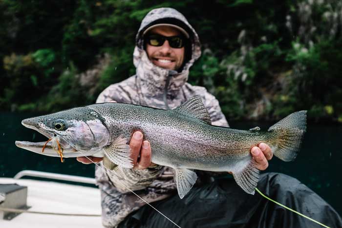 After another 10-15 minutes we finally reached the end of the lake. Marcelo cut the motor and grabbed the fishing gear, “dry or sinking line?” he asked, but before we could answer he started rigging the sinking line, “Sinking. Bigger fish.” He said with a smile. We rigged 2 rods with sinking line and streamers tied by Marcelo and one with a dry fly. We started to work along the bank under the power of a small trolling motor when Marcelo loudly exclaimed “FISH, FISH, FISH!” He was standing in the bottom of the boat pointing at where the fish was. I was standing on the casting deck and had yet to spot the fish. We slowly drifted closer towards where he was pointing and I finally spotted the fish. Noah was on the back casting deck with the dry ready. The fish was cruising just under the surface scanning for food when Noah’s cast dropped down 3-4 feet from him. The fish immediately turned, quickly swam over and confidently gulped it down. Fish on! A feisty fat 19” rainbow, which ended up being the smallest fish of the day. That was an easy start to the day and it never changed. Marcelo worked the little trolling motor along the bank, as if we were floating a river, spotting fish long before any of us did. We continued to catch fish cruising the surface on the dry until the clouds settled in and the rain began to fall. This is when the sinking lines started to really produce. Casting at the bank letting the line and fly sink and stripping it back was no less than complete joy for me in the water.