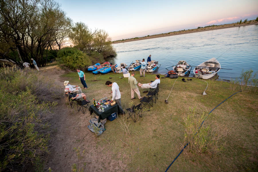 After a great day of fishing we floated into camp. The “unplugged” camps are very similar to our Smith River camps in Montana with a big wall tent serving as the kitchen, large Cabelas outfitter tents for sleeping complete with cots and sleeping pads. The guys also had a great on demand hot water system rigged for showering which was very welcome. The cook team were hard at work preparing steaks over open coals while we enjoyed the full bar set up along the river – not a bad way to camp!