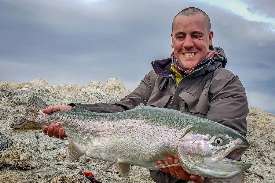 For me it was a slow start. I occasionally felt a little tug on the end of my line, but I just wasn’t sure. After my neighbor hooked and released multiple fish I decided it was time to switch up my tactics. I noticed he was stripping longer and faster than I was, so I followed suit. Before I knew it I was locked into something at the end of my line that could only be compared to the first carp I caught as a teenager. My rod was doubled over and it felt like I was locked up with a submarine. I quickly realized I needed to tighten down on the brakes a little, so I cranked down on my drag to slow the submarine down. When I felt the fish let up a little I would reel in as quickly as I could. I quickly learned that these fish don’t give up after a single big run. Once I felt like I was getting close to landing the fish it would take another run. After two or three good runs I was finally able to get the upper hand and bring the fish close to shore where my guide was waiting excitedly with a large net. Once in the bag I remembered a conversation I had with Brian when prepping me for the trip. He predicted that the first fish I landed was going to be the biggest trout of my life. He wasn’t wrong. When the guides called us in for lunch I realized I was already satiated. I could have walked away from Jurassic Lake after only a few fish with a smile on my face.