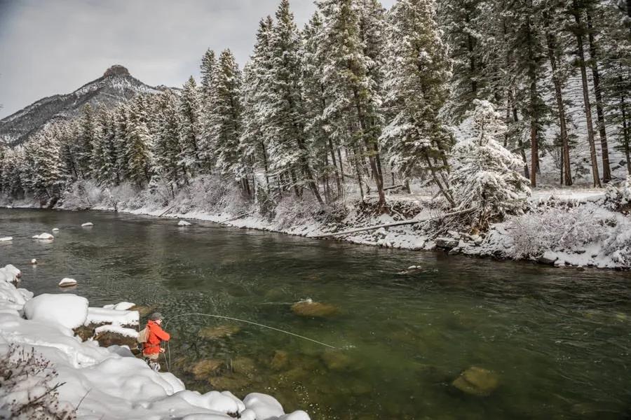 Cold water doesn't mean poor fishing. Remember trout are highly concentrated in their locations within the river and also feed in a compact period during the afternoon. This makes them relatively easy to target. A sunny afternoon in February can produce spectacular dry fly fishing for those willing to brave the cold. Although dry fly fishing is possible in the cold winter and early spring months in Montana, nymphing is more the norm. The low temperature fly presentation is characterized by flies that are fished just off the bottom and practically tumble into the mouths of holding trout. Remember trout are concentrated but also conserving energy. It pays to adjust weight and leader lengths with a delicate yarn indicator until you find the right rig. Make sure you are ONLY fishing the holes that have high trout counts and expect subtle takes.
