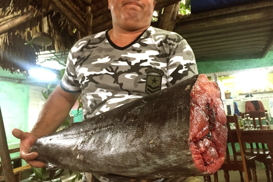 Kristin was taking a break to enjoy a fresh mango, so I assumed her position on the bow of the boat. I asked Felipe about a fly change, and he dug through my fly box and pulled out a fly I had been gifted a few days earlier by a German man who had just finished a few days of fishing on the river… ‘This one will work’ Felipe shared as he handed me the fly. A few casts later, I felt a surge of energy at the end of my line. I gripped fly line with my left hand pulled as hard as I could to set the hook deep into whatever was pulling on the other end. Sixty feet from the boat, the river’s surface erupted as a silver king blasted into the air… “Holy shit!” was all I could say as I laid eyes on the 80+ pound beast. As the fish reentered the water, I stripped the line again in an attempt to drive the hook deep into it’s boney jaw. The line peeled a short distance more, before the tension was gone. The entire rush took less than 30 seconds, but for me, time stood still.